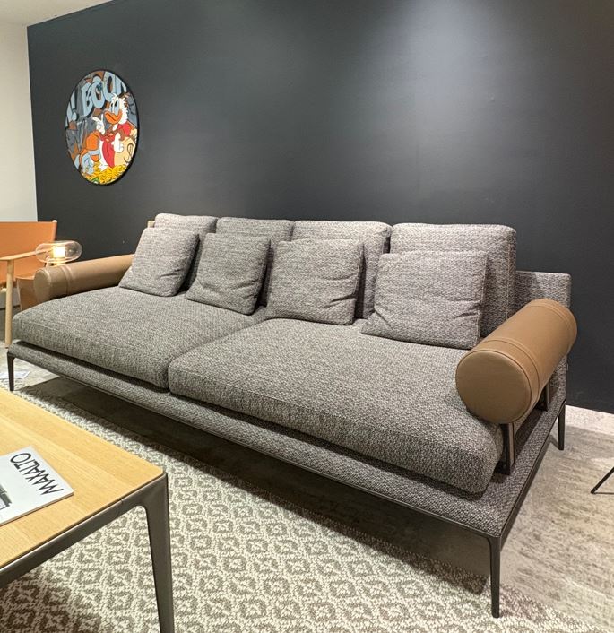 Châssis intérieur : tubes et profilés d’acier / Coussin assise : polyuréthane profilé à densité différenciée, plume stérilisée, housse en fibre de polyester Coussin dossier : polyuréthane profilé, plume stérilisée / Coussin appui-reins : plume