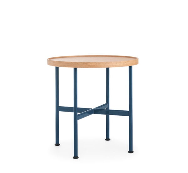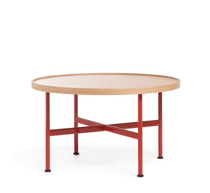 Structure en tube d’acier, verni poli / Plateau plaqué chêne naturel / Disponible plateau extra D41,5 pour la table D50 cm