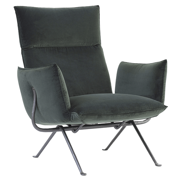Fauteuil avec dossier haut / Structure en fer forgé verni polyester / Coussins en polyuréthane expansé, avec revêtement en cuir ou en tissu déhoussable / Coussin appui-reins et ottoman aussi disponibles
